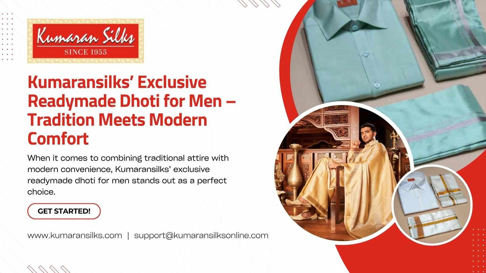 The fusion of heritage and convenience is what sets Kumaransilks’ readymade dhoti for men apart. It’s not just clothing; it’s a statement of cultural pride, refined taste, and thoughtful design. These dhotis allow men to experience the grace of traditional wear without compromising on practicality, making them a must-have in every wardrobe.